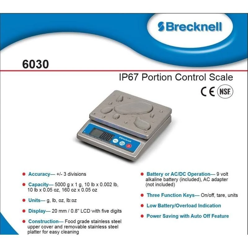 The Brecknell 6030 washdown scale has a capacity of 10 pounds and readability of 0.002 pounds with a pan size of 5.9 x 4.7 inches. The Brecknell 6030 IP67 portion control scale is constructed with a food grade stainless steel upper cover and a removable stainless steel platter for easy cleaning making it ideal for use in washdown environments.